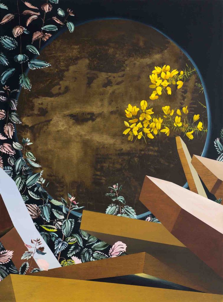 Titles such ‘Mirror, Mirror’ allude to the act of looking, of viewing. ‘Mirror, Mirror’, like the age-old fairytale asks us to question what we see, what the current state of affairs is. ‘Monitor 1’ and ‘Monitor 2’ are in the format of a living room tv, each framed in a multitude of plants, drawing the viewer in to look at what is framed within – notice the interrelation and repeated fragments in these works. The internet overloads us with undigested information, and we live with the threat of societal manipulation through social media. These paintings do not present any new information, but rather suggest new ways of looking and provide space for the viewer to look and think, and to form an individual opinion. ‘Haven’ shows fragments of spaces, modular type shapes can be seen in the background, fallen pieces in the foreground, the title alluding to our basic human requirements for a roof over our heads and the dignity of having a personal space. Again, the colour and composition are playful, suggestive of re-thinking, and of problem solving. The chosen colours, for example in ‘Red Earth’ describe a space through the prism of lived human experience. ‘Mesozoic Dance’ features delicate magnolia flowers, a tree that has existed for over 95 million years, before bees had evolved. Its dancing impermanent petals belie the strength and persistence of this tree that has survived and thrived – despite all – since the time of the dinosaurs.