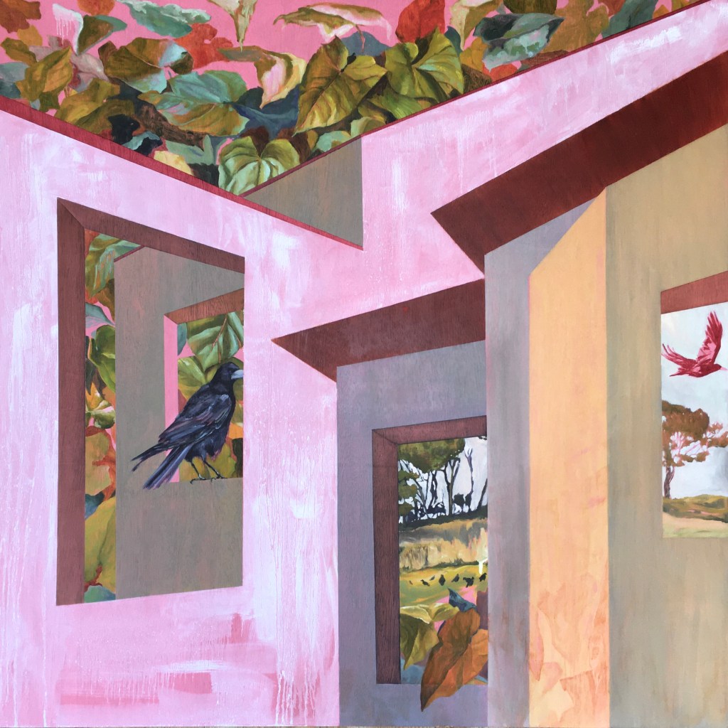 Pink Crow, Oil on Wooden Panel, 122 x 122cm